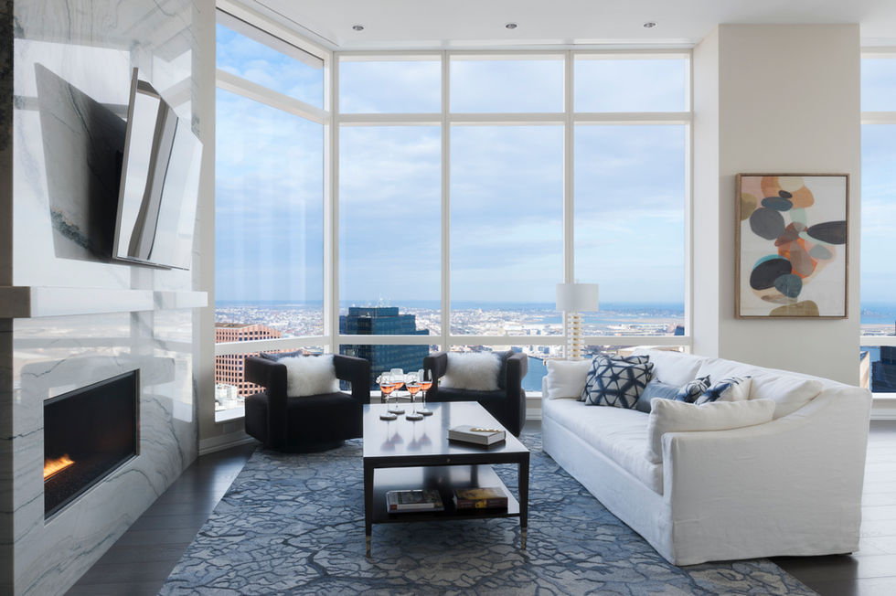 This penthouse condominium in one of Boston’s most prestigious buildings was designed as a sophisticated home above the clouds. The color palette in whites and blues balances timeless elegance with luxurious comfort. Expansive windows frame breathtaking city and sky views, while a natural stone fireplace in deep blue adds warmth and sculptural presence. Every detail — from curated furnishings to layered textures — enhances light, space, and serenity, creating a home that is both uplifting and intimate, a refined retreat in the heart of the city.